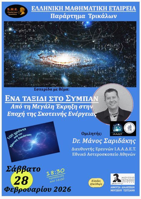 Το Παράρτημα Τρικάλων της Ελληνικής Μαθηματικής Εταιρείας διοργανώνει επιστημονική εκδήλωση με θέμα «Ταξίδι στο Σύμπαν: Από τη Μεγάλη Έκρηξη στην εποχή της Σκοτεινής Ενέργειας», το Σάββατο 28 Φεβρουαρίου 2026 και ώρα 18:30, στην αίθουσα διαλέξεων του Μουσείου Τσιτσάνη.