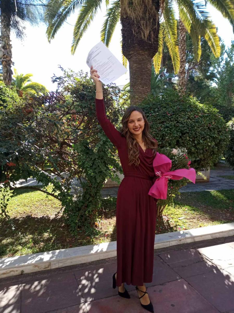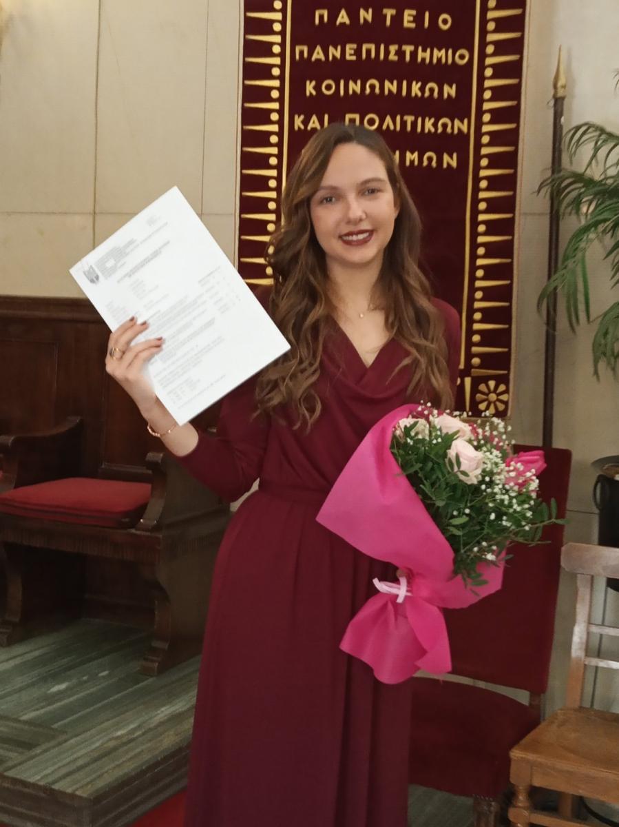 Η ανθυπολοχαγός του υγειονομικού σώματος που υπηρετεί στην 95 ΑΔΤΕ της Ρόδου, ανήμερα της ονομαστικής της εορτής, αναγορεύτηκε πτυχιούχος μεταπτυχιακών σπουδών του τμήματος Ψυχολογίας του Παντείου Πανεπιστημίου, αφού ολοκλήρωσε με επιτυχία το μεταπτυχιακό της με τίτλο “Κοινωνική Ψυχολογία των Συγκρούσεων”, επιδεικνύοντας, έτσι, το άοκνο ενδιαφέρον της για την επιστήμη. Η τελετή έλαβε χώρα στην αίθουσα τελετών του Πανεπιστημίου, παρουσία συγγενών και φίλων. Ευχόμαστε από καρδιάς συγχαρητήρια, καλή σταδιοδρομία και συνεχή πρόοδο στη νέα πτυχιούχο!