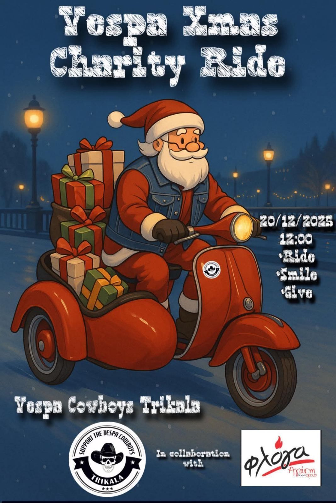 Το Vespa Xmas Charity Ride των Vespa Cowboys Trikala μας καλεί να οδηγήσουμε, να χαρίσουμε χαμόγελα και να προσφέρουμε αγάπη αυτές τις γιορτές. To Σάββατο 12 Δεκεμβρίου στις 12.00μμ σε συνεργασία με την Φλόγα Τρικάλων. Γιατί τα Χριστούγεννα έχουν αξία όταν μοιράζονται.