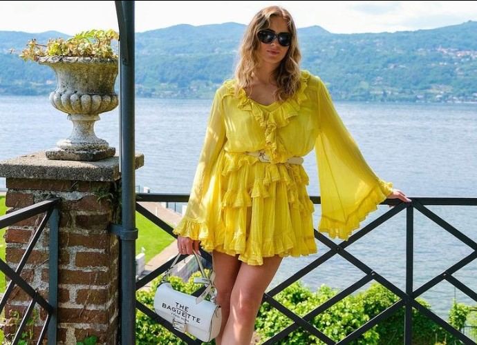 Καλυμμένο σε μια ζωηρή απόχρωση του κίτρινου, το κοντό φόρεμα που εμφανίζεται στα social media από τη Valentina Ferragni χαρακτηρίζεται από μια σειρά από βολάν και μπούκλες στη λαιμόκοψη, τη φούστα και τα μανίκια που δίνουν μια αναιδή και ζωηρή πινελιά σε όλο το look. Για να του δώσει ακόμα πιο ενδιαφέρουσα πινελιά, ο επιχειρηματίας έκλεισε τη μέση με λευκή ζώνη με αγκράφα ton sur ton.