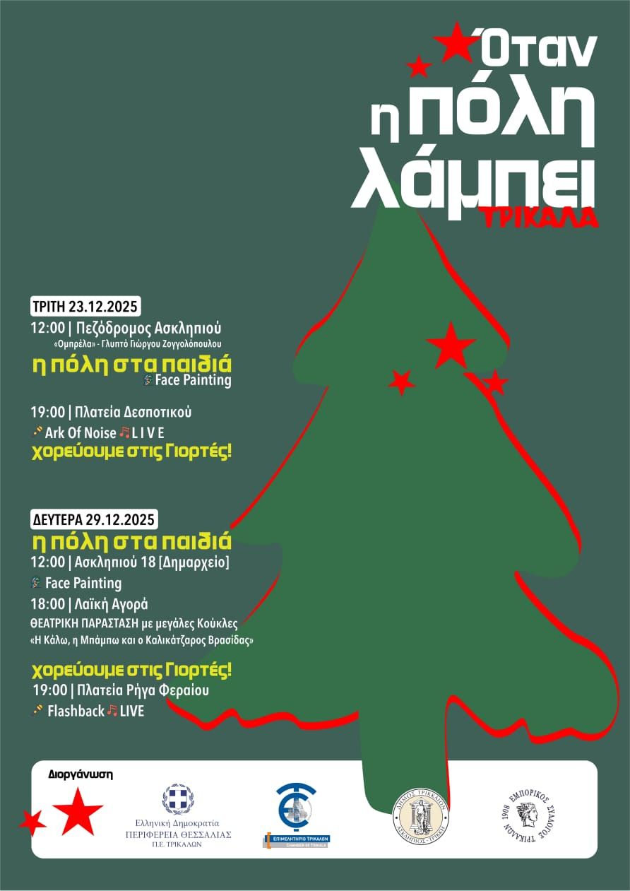 Εορταστικές χριστουγεννιάτικες εκδηλώσεις θα πραγματοποιηθούν στα Τρίκαλα με τη συνεργασία της Περιφέρειας Θεσσαλίας, του Επιμελητηρίου Τρικάλων, του Δήμου Τρικκαίων και του Εμπορικού Συλλόγου Τρικάλων για την τόνωση της τοπικής αγοράς, την ενίσχυση της εμπορικής κίνησης και τη δημιουργία ενός εορταστικού κλίματος για μικρούς και μεγάλους.