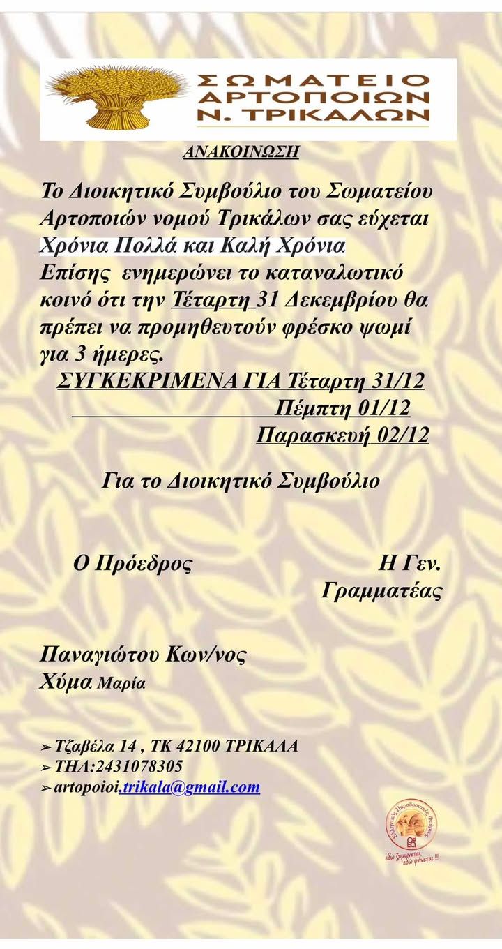 Κλειστά θα παραμείνουν όλα τα αρτοποιεία στα Τρίκαλα για δύο ημέρες, σύμφωνα με ενημέρωση του Σωματείου Αρτοποιών Τρικάλων, το οποίο καλεί τους πολίτες να προμηθευτούν ψωμί για τουλάχιστον τρεις ημέρες, ώστε να μην υπάρξουν προβλήματα στην καθημερινή τροφοδοσία.