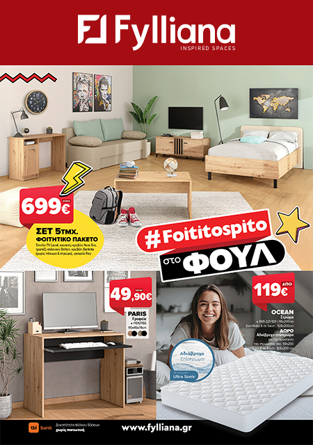 Νέο ξεκίνημα σε νέα πόλη; Ό,τι χρειάζεσαι για το φοιτητικό σου σπίτι, θα το βρεις στη Fylliana! Έπιπλα για κάθε ανάγκη, στρώματα, διακοσμητικά  και λύσεις που χωράνε σε κάθε χώρο και κάθε budget. Έλα στο κατάστημα Fylliana στα Τρίκαλα και φτιάξε το σπίτι σου εύκολα, με πλάνο δόσεων με ή χωρίς πιστωτική!»