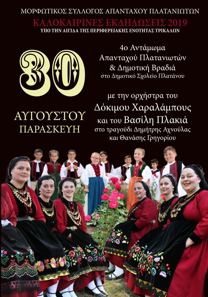 Ο Μορφωτικός Σύλλογος Απανταχού Πλατανιωτών διοργανώνει το 4ο Αντάμωμα Απανταχού Πλατανιωτών και δημοτική βραδιά. Η εκδήλωση θα πραγματοποιηθεί την Παρασκευή 30 Αυγούστου και ώρα 21:00 στο δημοτικό σχολείο του Πλατάνου με την ορχήστρα του Δόκιμου Χαραλάμπους στο κλαρίνο και του Βασίλη Πλακιά στο βιολί. Στο τραγούδι ο Δημήτρης Αχνούλας και ο Θανάσης Γρηγορίου. Θα εμφανιστούν οι χορευτικές ομάδες του συλλόγου. Σας περιμένουμε όλους για ένα παραδοσιακό γλέντι.