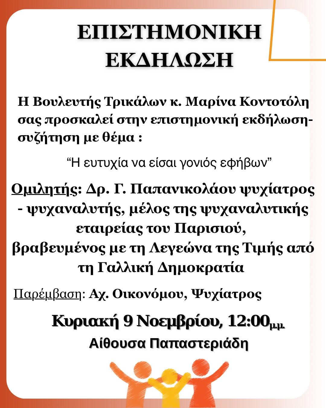 Η εκδήλωση θα πραγματοποιηθεί την Κυριακή 9 Νοεμβρίου και ώρα 12:00 μ.μ., στην Αίθουσα Παπαστεριάδη, Στουρνάρα 14, Τρίκαλα.