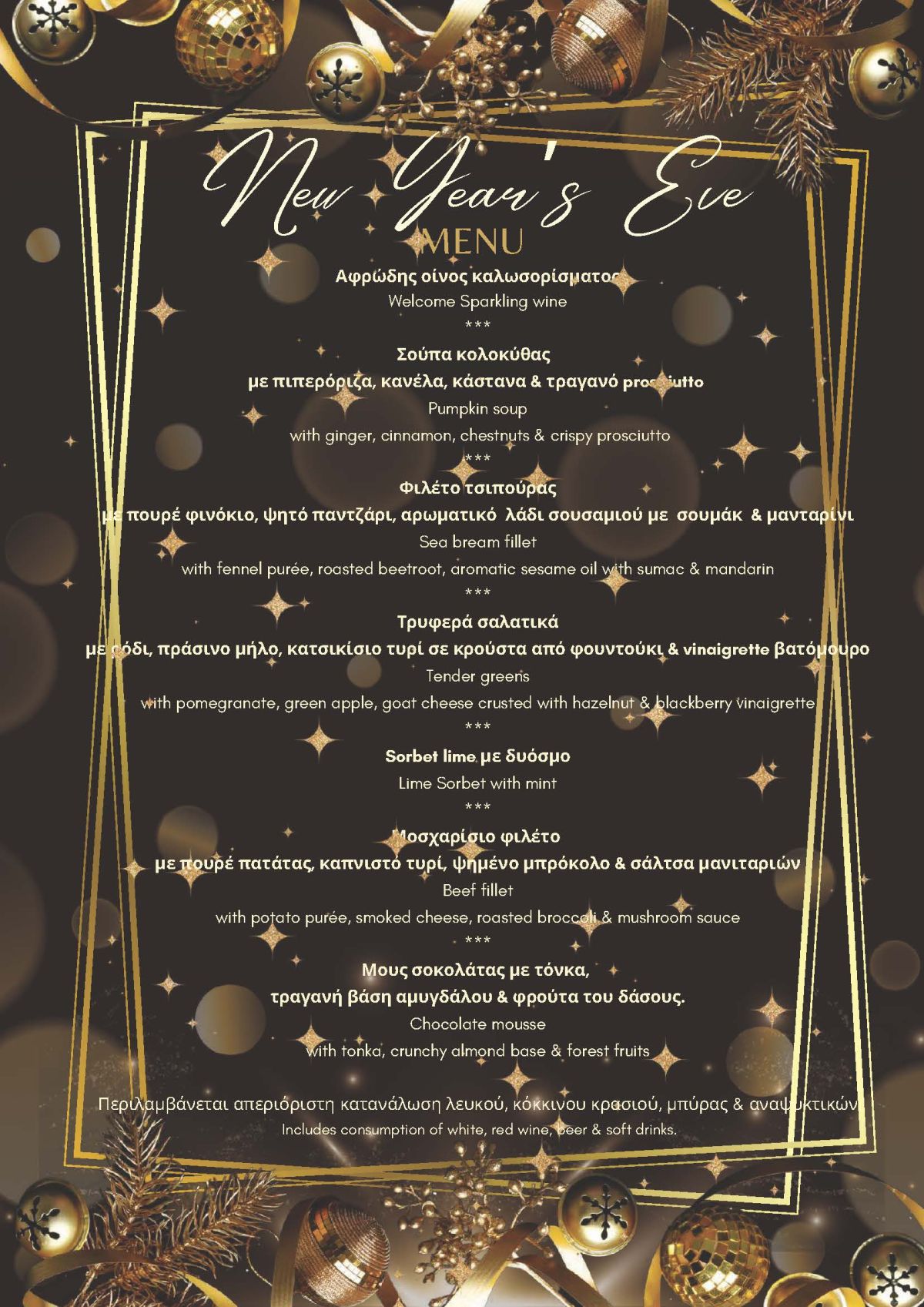 Την παραμονή της Πρωτοχρονιάς ο Executive Chef Ιωάννης Ντούρος έχει ετοιμάσει ένα εορταστικό μενού 6 πιάτων υπό τη συνοδεία live jazz μουσικής με τη Σία Κοσκινά, που υπόσχεται να ικανοποιήσει και τους πιο απαιτητικούς (100€ το άτομο με απεριόριστη κατανάλωση σε ποτά). Ανήμερα των Χριστουγέννων και της