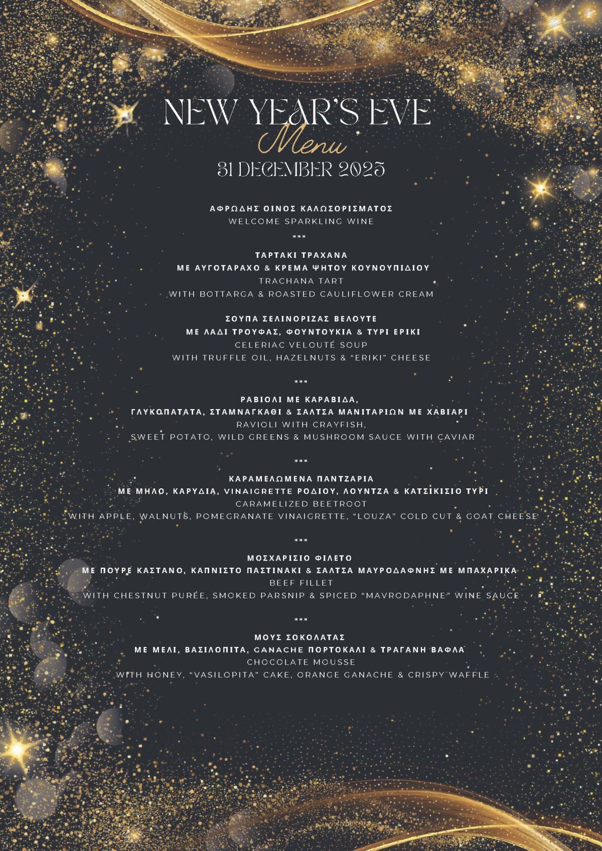 Πρωτοχρονιάς η διάρκεια σερβιρίσματος του πρωϊνού μπουφέ παρατείνεται μέχρι τη 13:00 και εμπλουτίζεται με επιπλέον ζεστά εδέσματα και γλυκά, για όσους ξενυχτήσουν το προηγούμενο βράδυ και θέλουν να ξεκινήσουν πιο αργά την ημέρα τους (20€ το άτομο). Μοναδικά πακέτα που συνδυάζουν διαμονή μαζί με ρεβεγιόν θα