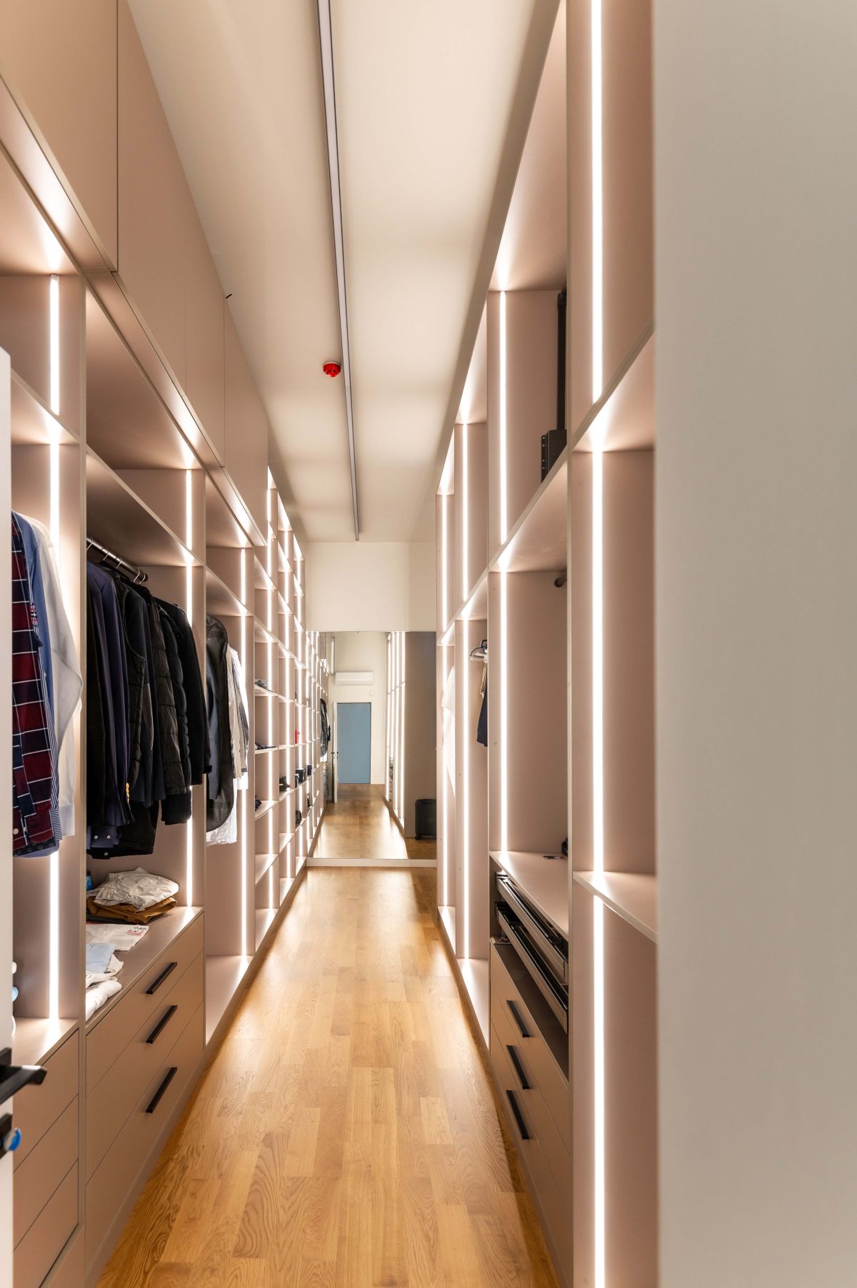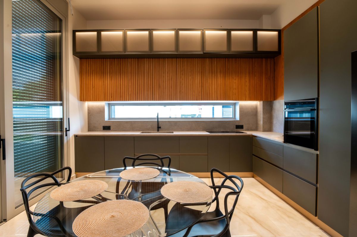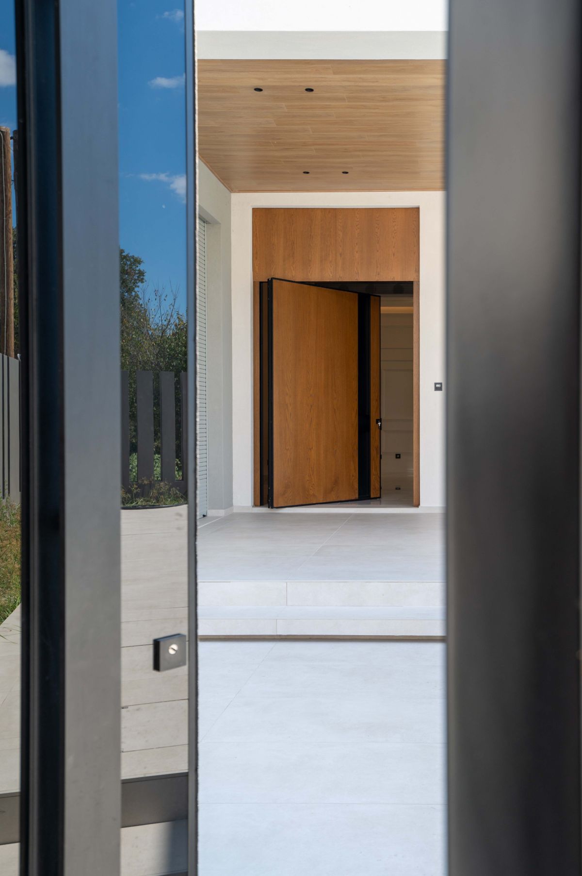 Οι πόρτες Sabadoor, εξωτερικές pivot με ξύλο και τζάμι και εσωτερικές συνεπίπεδες suite με soft close, προσθέτουν αίσθηση minimal πολυτέλειας, αναδεικνύοντας τη σημασία του σωστού σχεδιασμού στις λεπτομέρειες που κάνουν τη διαφορά.