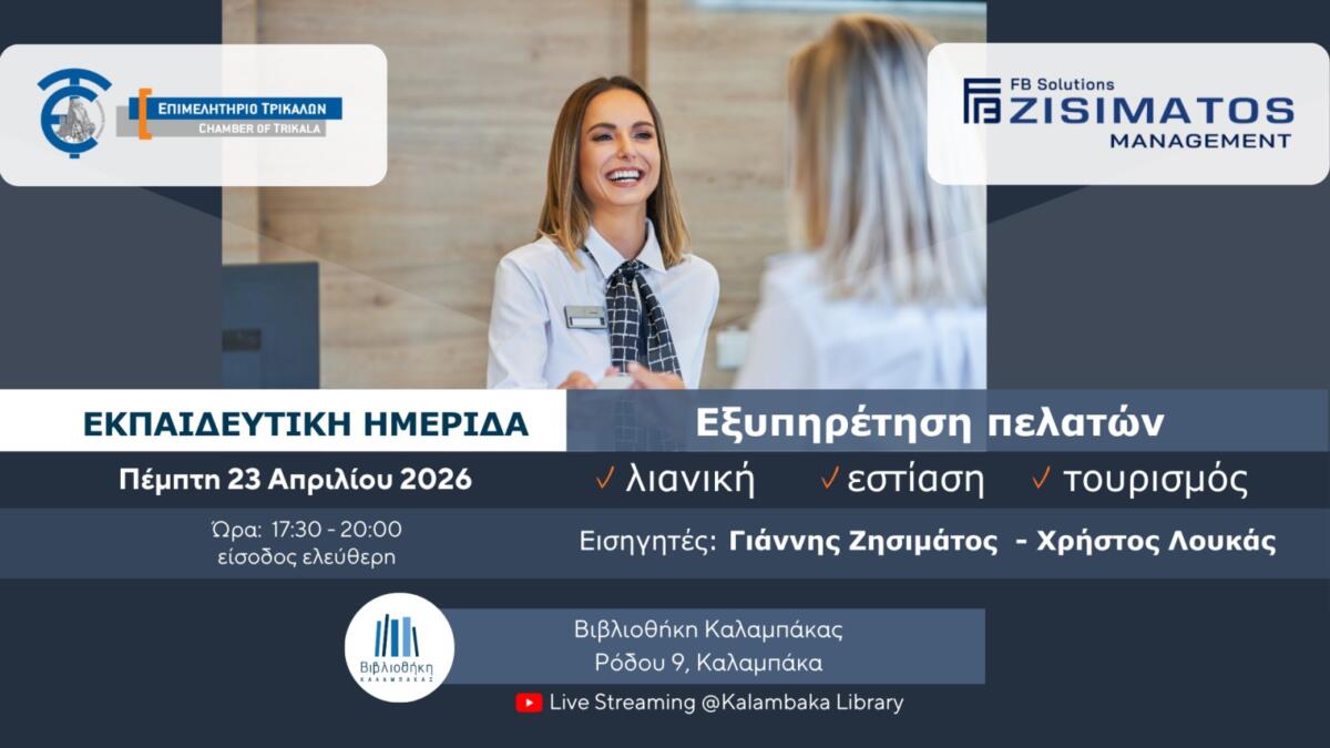 Το Επιμελητήριο Τρικάλων σας προσκαλεί στην εκπαιδευτική ημερίδα με θέμα: «Εξυπηρέτηση πελατών στη λιανική, στην εστίαση και στον τουρισμό», που θα πραγματοποιηθεί την Πέμπτη, 23 Απριλίου 2026 και ώρες 17:30 – 20:00, στη Βιβλιοθήκη Καλαμπάκας (Ρόδου 9, Καλαμπάκα).