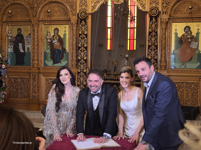 Μια υπέροχη «συμφωνία» αγάπης γράφτηκε χθες στον Ιερό Ναό Αγίου Γεδεών Τυρνάβου. Ο μαέστρος της Φιλαρμονικής, Θέμης, και η εκλεκτή της καρδιάς του, Μαρία, ενώθηκαν με τα δεσμά του γάμου, ενώ αμέσως μετά βάπτισαν τον γιο τους, Νικόλαο! Στο πλευρό του ζευγαριού στάθηκαν ως κουμπάροι ο Δήμαρχος Τυρνάβου, Στέλιος Τσικριτσής και η σύντροφος του Ειρήνη, ενώ πνευματικοί γονείς του μικρού Νικόλαου έγιναν οι νονοί Σταύρος και Λία Γεωργίου.