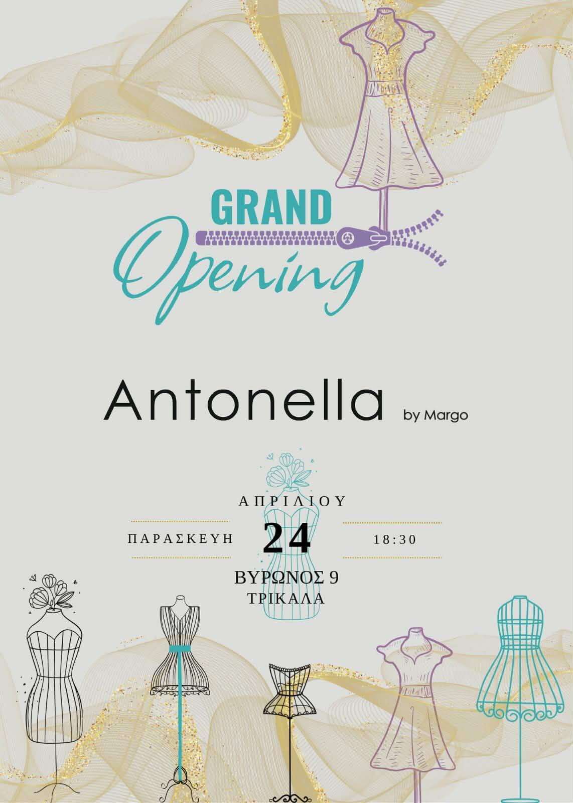 Την Παρασκευή εγκαινιάζεται το νέο κατάστημα γυναικείων ενδυμάτων Antonella by Μαργκώ, στην οδό Βύρωνος 9, στα Τρίκαλα. Με νέα brands και ανανεωμένη αισθητική, υπό την επιμέλεια της Τζίνας Μπέη, το κατάστημα έρχεται να δώσει φρέσκο αέρα στο γυναικείο στυλ της πόλης.