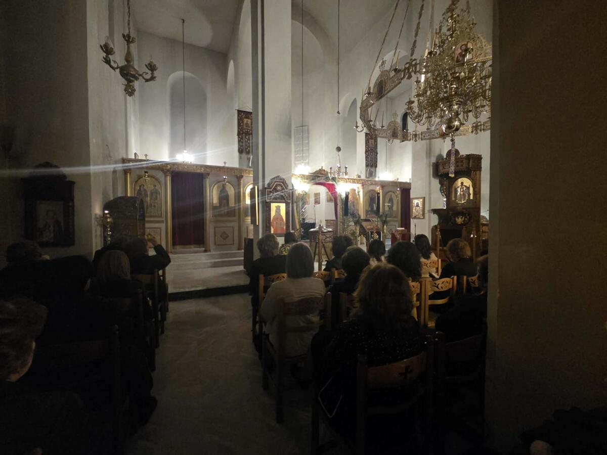 Ο πατήρ Βασίλειος Μπουκής, πλαισιωμένος από τους ιεροψάλτες, οδήγησε τους πιστούς σε μια κατανυκτική ατμόσφαιρα, όπου κυριάρχησαν οι ύμνοι της ημέρας και το βαθύ νόημα της μετάνοιας. Οι παρευρισκόμενοι συμμετείχαν με ευλάβεια, γεμίζοντας τον ναό από νωρίς και παρακολουθώντας με προσήλωση την ακολουθία.