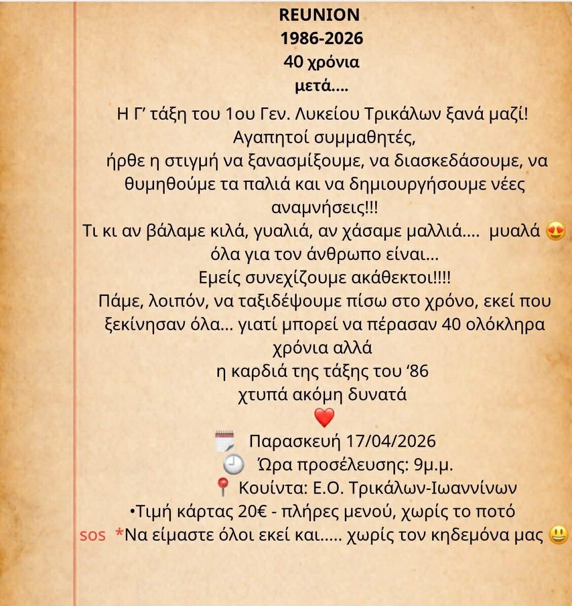 Με έντονο το άρωμα νοσταλγίας και συγκίνησης, η τάξη του 1986 από το 1ο Γενικό Λύκειο Τρικάλων ετοιμάζεται να συναντηθεί ξανά, 40 ολόκληρα χρόνια μετά την αποφοίτησή της. Ένα ξεχωριστό reunion που δεν είναι απλώς μια συνάντηση, αλλά ένα ταξίδι πίσω στον χρόνο, γεμάτο αναμνήσεις, χαμόγελα και ιστορίες που έμειναν ζωντανές.