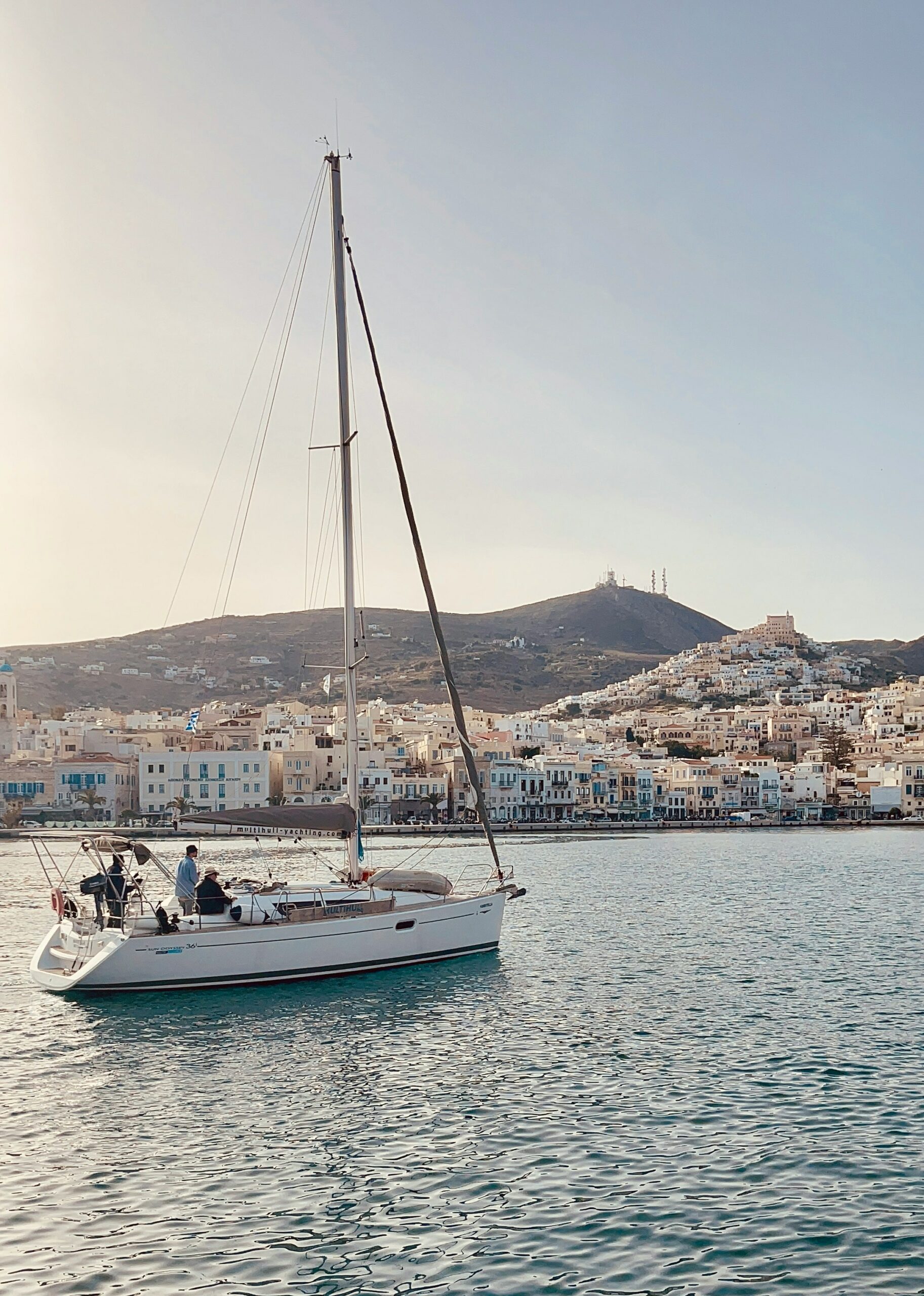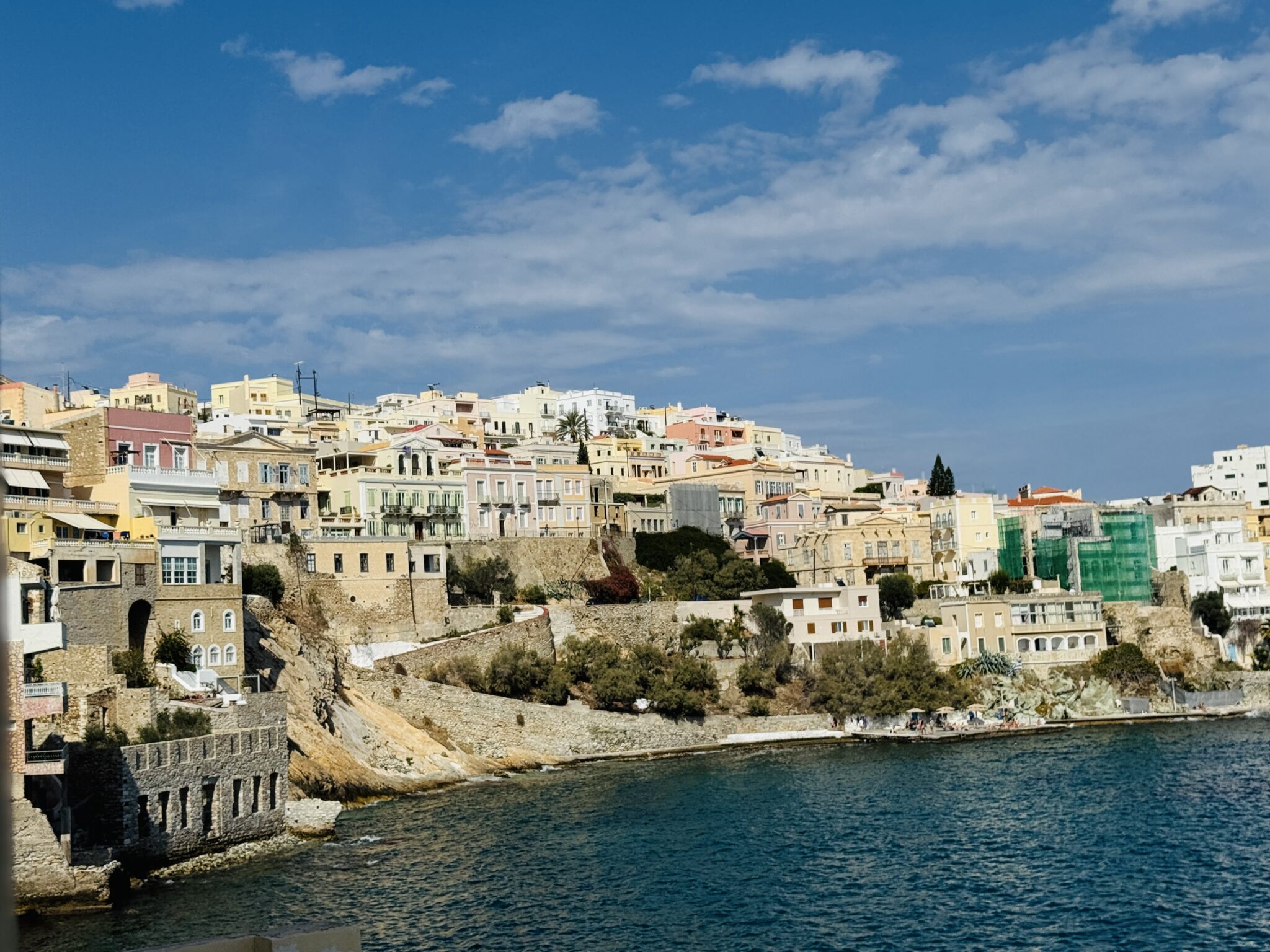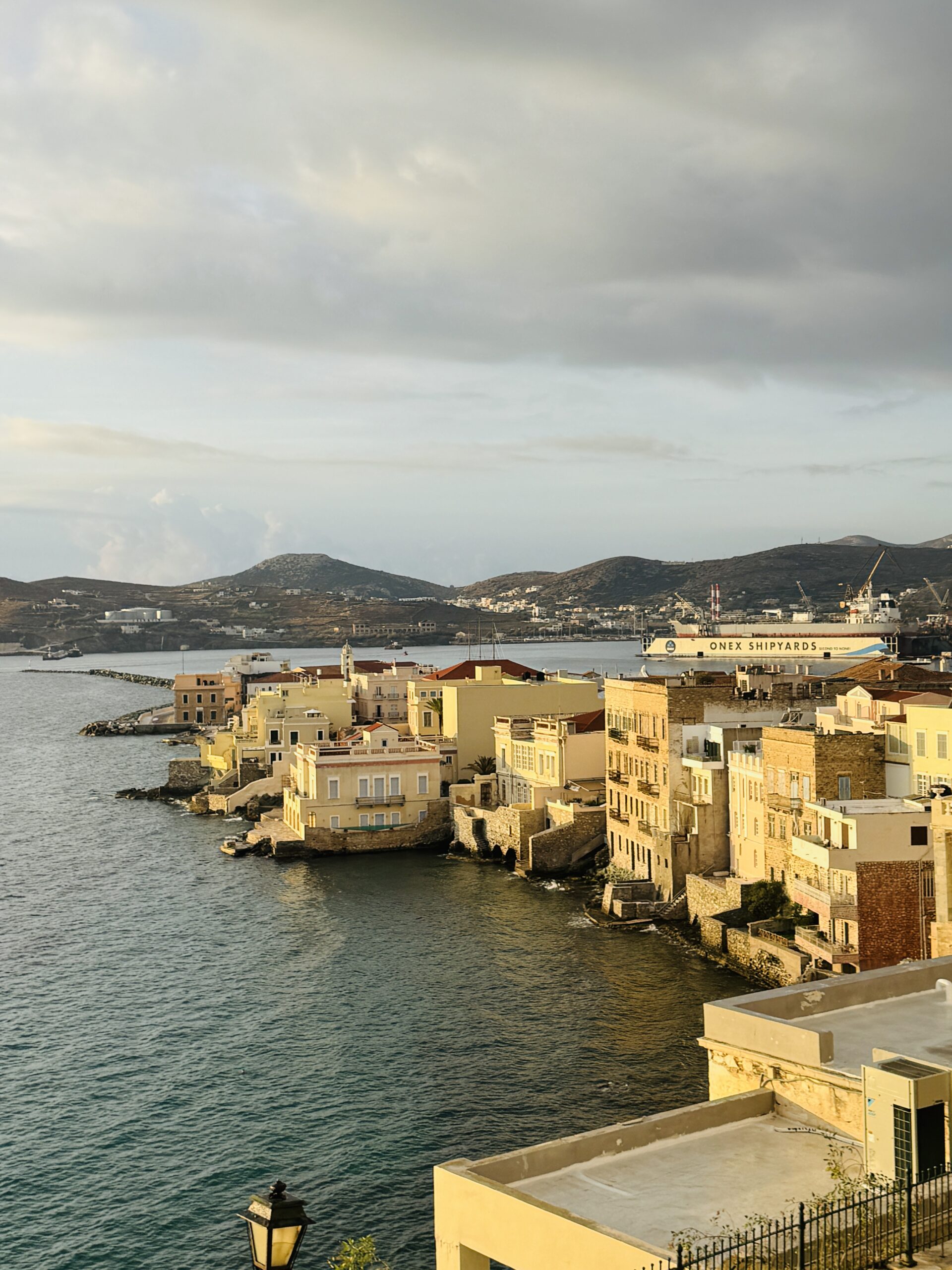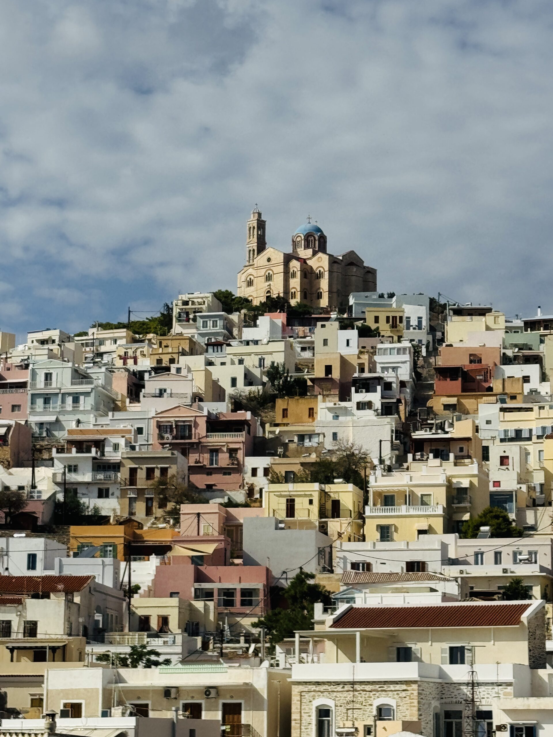 Η πρώτη εικόνα της Σύρου, καθώς το πλοίο πλησιάζει στο λιμάνι, είναι ένα οπτικό αριστούργημα. Μία ανατροπή όλων όσων περιμένει κανείς από τις Κυκλάδες. Εδώ δεν κυριαρχούν οι ασβεστωμένοι κυβόσχημοι όγκοι και τα γαλάζια πορτοπαράθυρα. Αντ’ αυτών, ένα αμφιθεατρικό πανόραμα από νεοκλασικά αρχοντικά σε αποχρώσεις ώχρας υψώνεται πάνω από τη θάλασσα, δημιουργώντας έναν αστικό ιστό που αποπνέει τον κοσμοπολίτικο αέρα του 19ου αιώνα.
