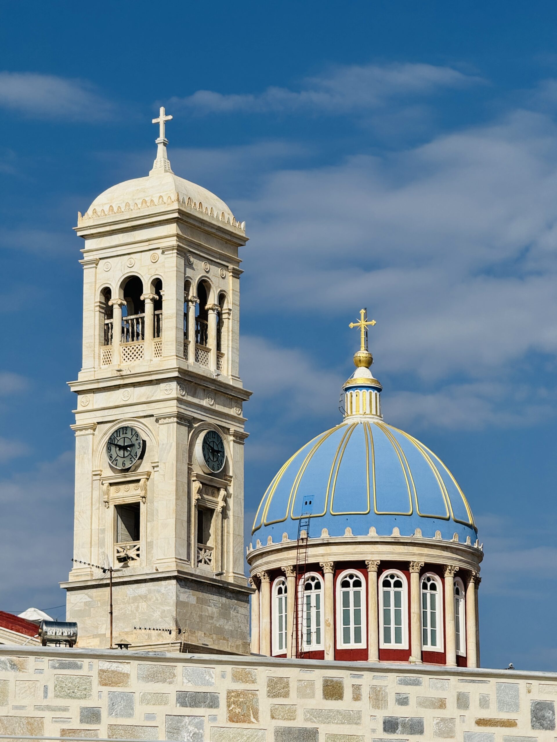 Η μνημειώδης μαρμάρινη σκάλα, τα προπύλαια με τους ιωνικούς κίονες, τα πανύψηλα κωδωνοστάσια και το πολυτελές εσωτερικό μαρτυρούν μια εποχή πρωτοφανούς ευμάρειας. Το μαρμάρινο τέμπλο είναι έργο του γλύπτη Γεωργίου Βιτάλη από την Τήνο, ενώ οι εικόνες αργυρώθηκαν και αγιογραφήθηκαν στη Μόσχα. Ο ναός είναι και η υλική αποτύπωση της δύναμης και της πίστης που διαμόρφωσαν την Ερμούπολη. Και ακριβώς δίπλα σε αυτόν τον τιτάνα, σχεδόν κρυμμένο στη σκιά του, ξεπροβάλλει το Saint.