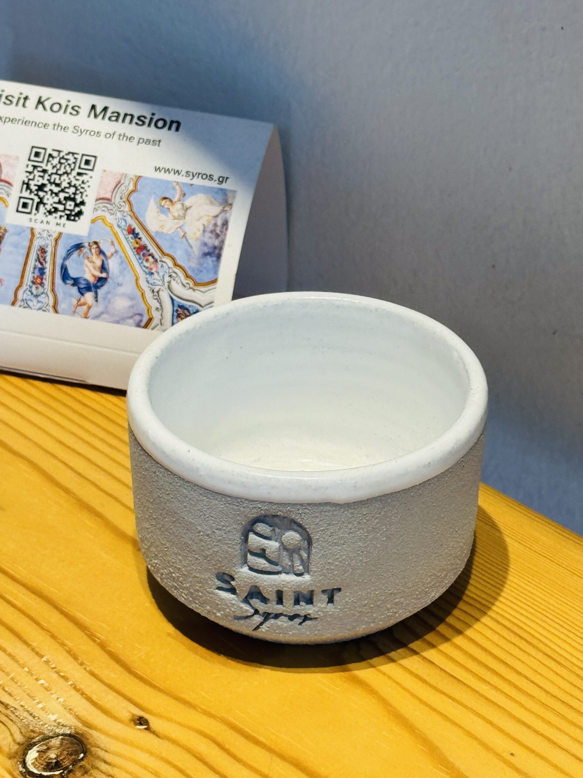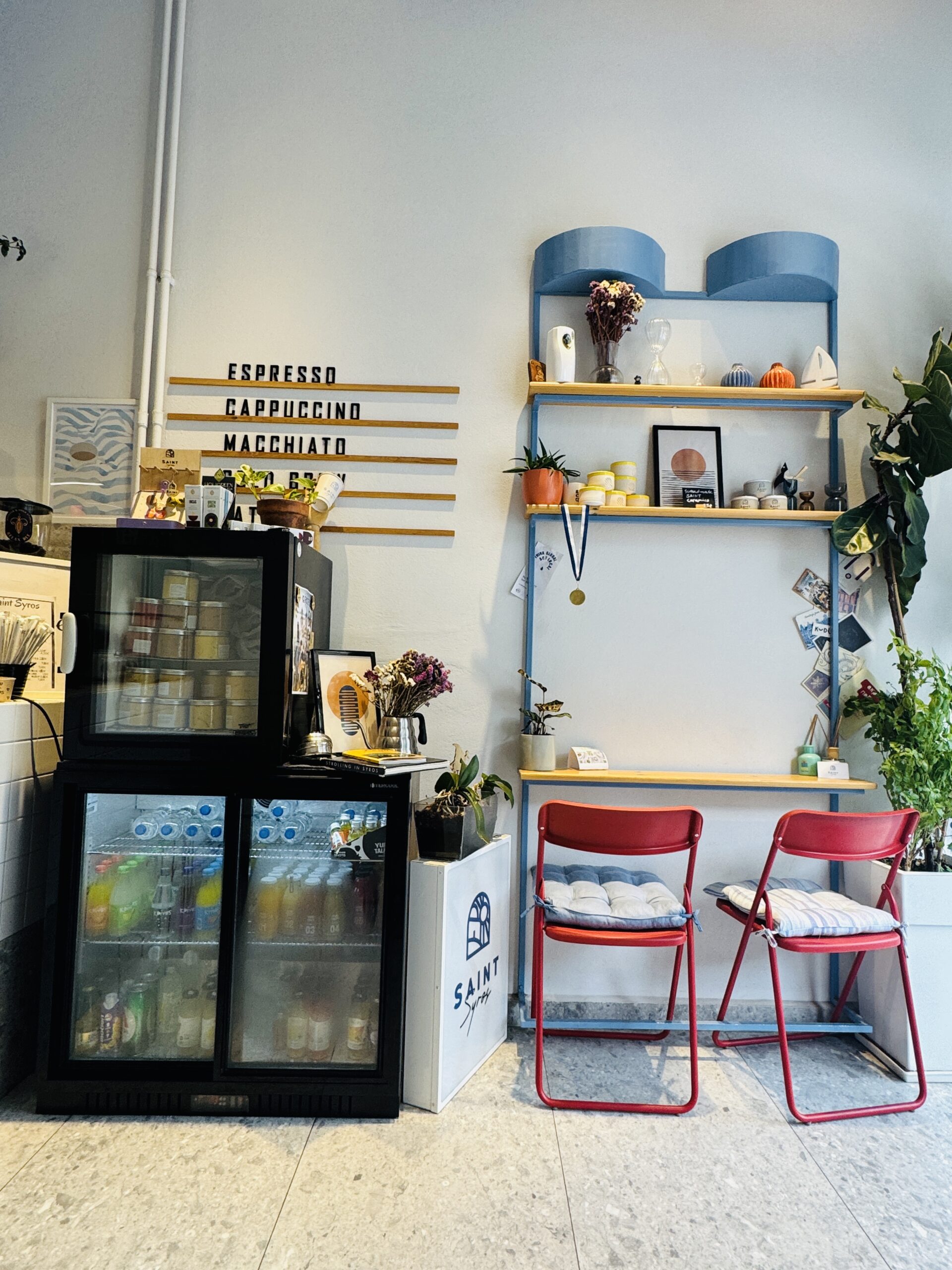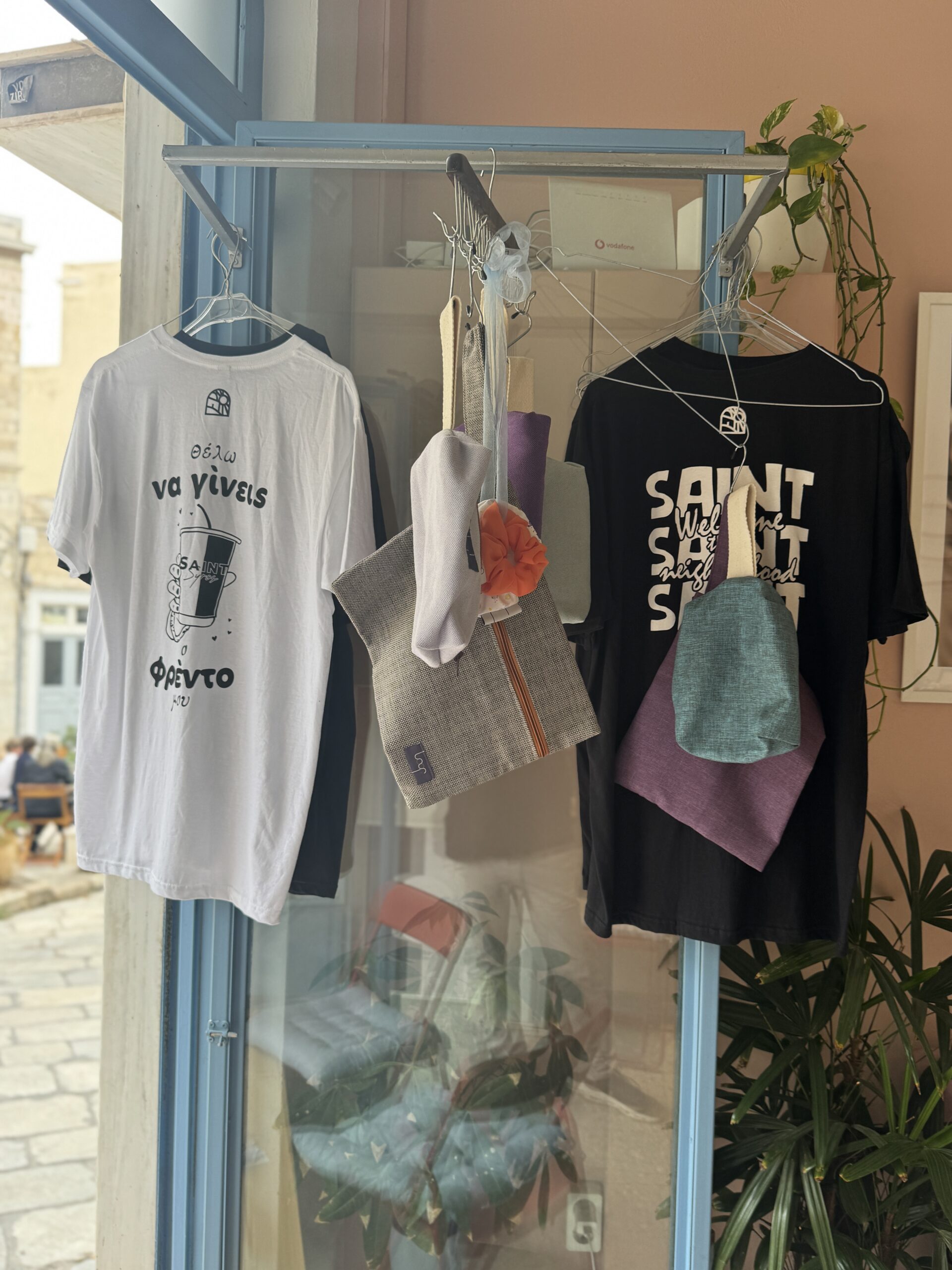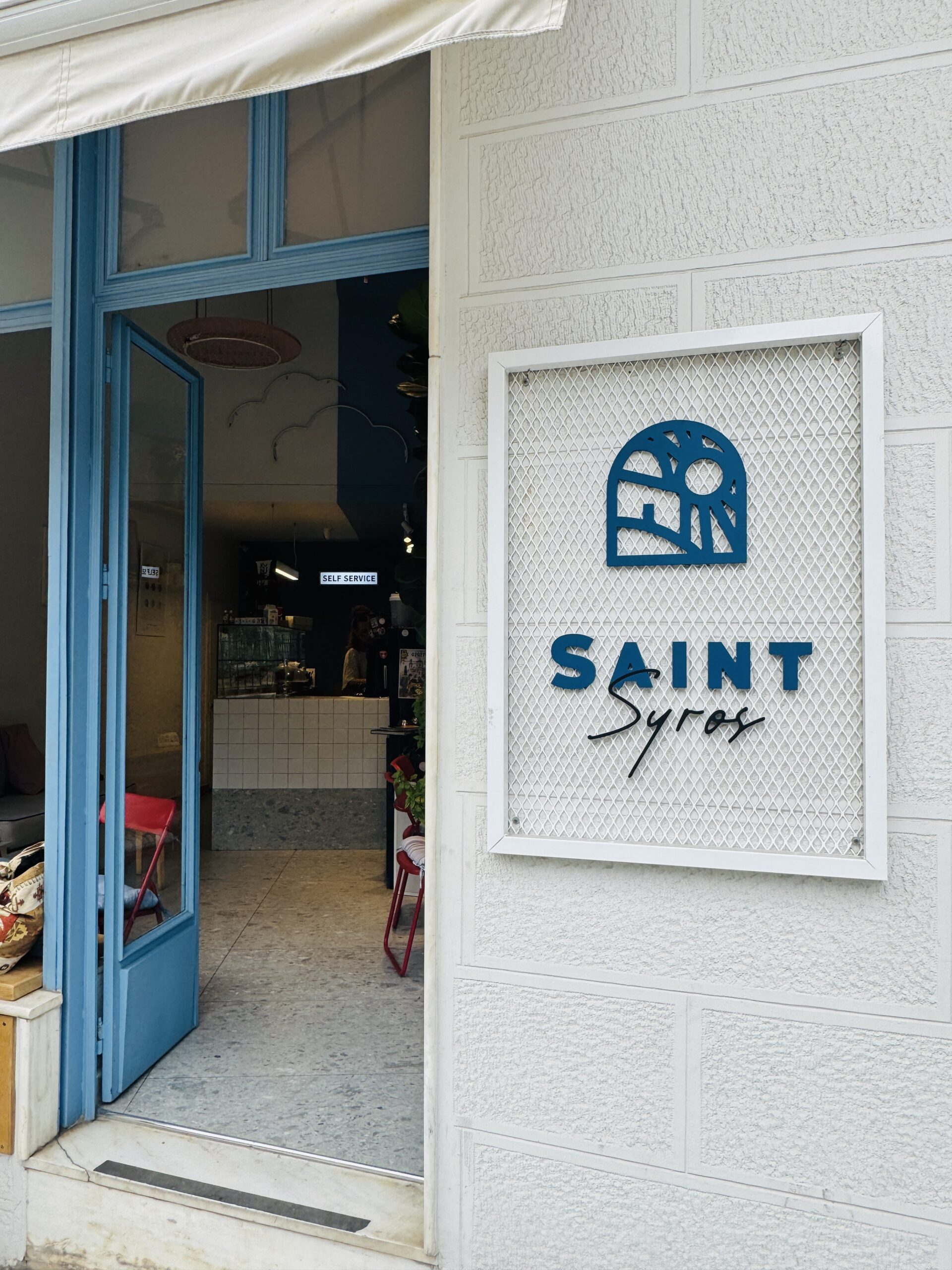Το μαγαζί της Χριστίνας Βελώνη είναι «μία σταλιά», όπως το περιγράφει η ίδια, αλλά με χαρακτήρα. Το όνομά του, Saint, είναι μια λιτή και ευρηματική αναφορά στον πανίσχυρο γείτονά του. Δεν πρόκειται για προσπάθεια σύγκρισης, αλλά για έκφραση σεβασμού και συμβίωσης: ένας διάλογος ανάμεσα στο παρελθόν και το παρόν της Σύρου.